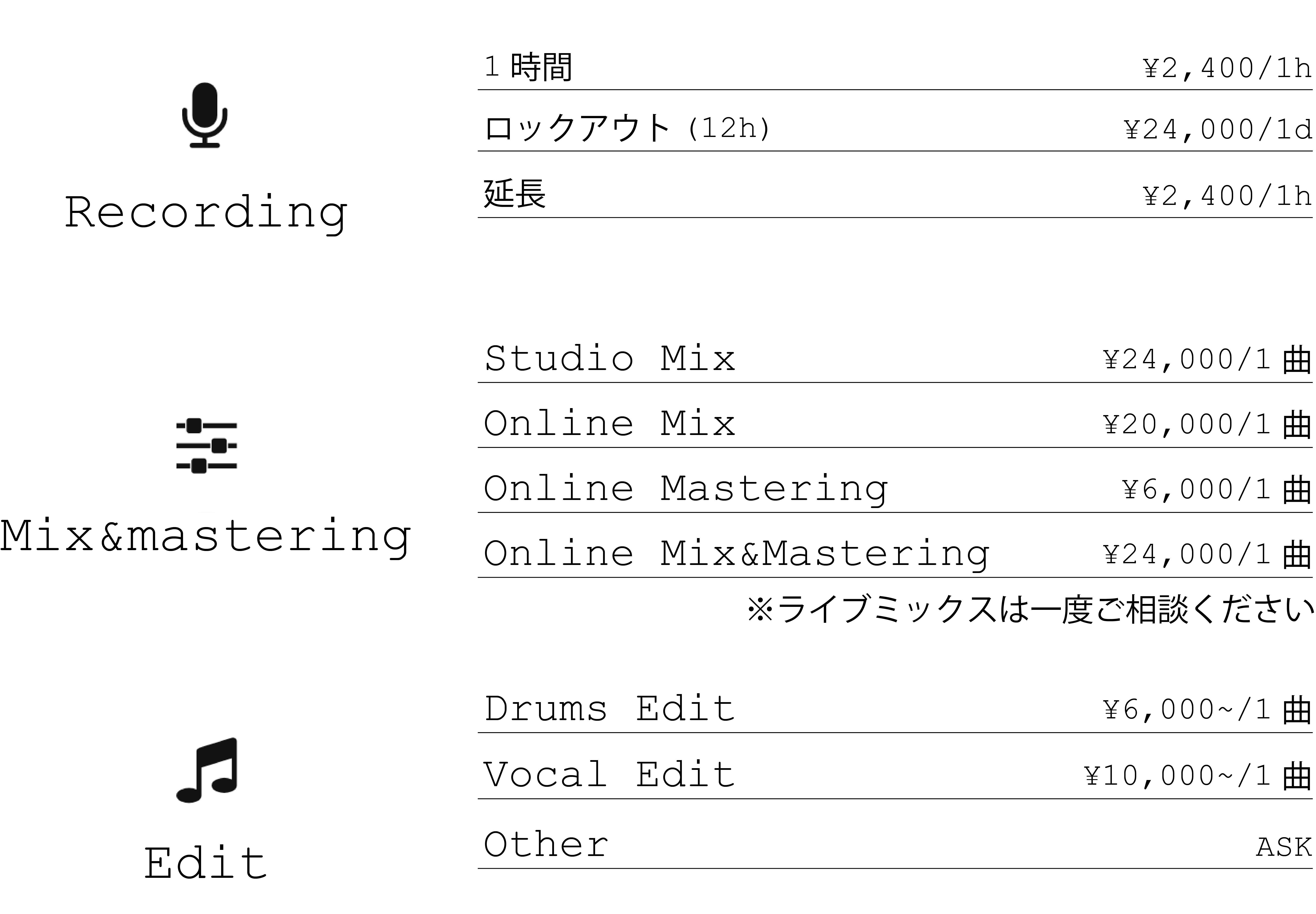 ※全て税抜き価格になります ホームページを見た!とお伝えいただければ初回お試し価格にてお受けいたします! 尚、アーティストが違う場合でも1クライアント様1回とさせていただきます。 ご了承いただきますようお願い申し上げます。